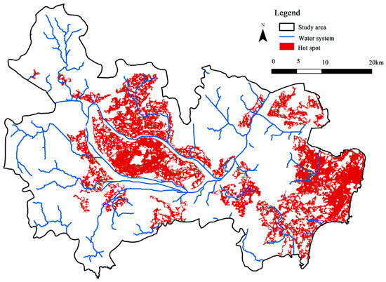 We identified various cold and hot spots in Fuzhou (Figure 3). The hot spots in Cangshan District were distributed in areas other than Jianxin Town and the Sanjiangkou Zone. The hot spots in Gulou District were distributed in areas other than parks and green areas, such as Jinniushan, Xihu–Zuohai, and Pingshan Parks. The hot spots were distributed throughout the entire area of Taijiang District, which has less vegetation and water bodies and more construction land. The hot spots in Jin’an District were distributed in the northern and primary urban areas. Many hot spots were distributed in the residential areas of East Riverside, Tingjiang Town, and Lanqi Island in Mawei District. The hot spots were large in the primary urban and airport areas and other township built-up areas in Changle District. The hot spots in Minhou County were distributed in the High-tech Zone, Ganhong Road residential area, part of Ganzhe Town, Nanyu residential area, Nantong Township, and Qingkou Industrial Zone.