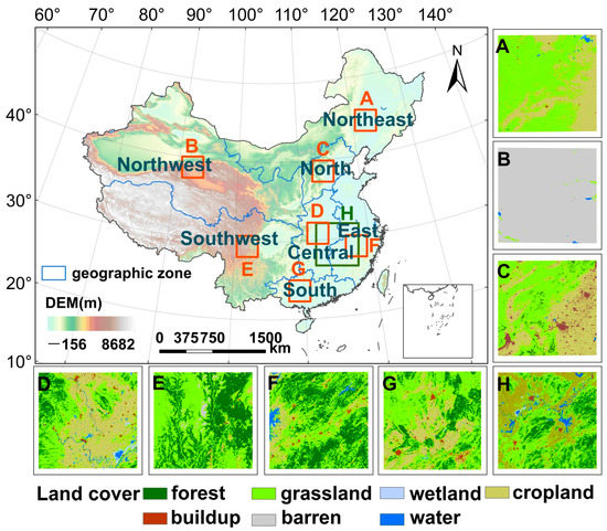 Study areas. The red boxes in the figure represent Regions A–G; the green box represents Region H; and subfigures (A–H) represent the land cover types in 2018 of the eight study areas, respectively.