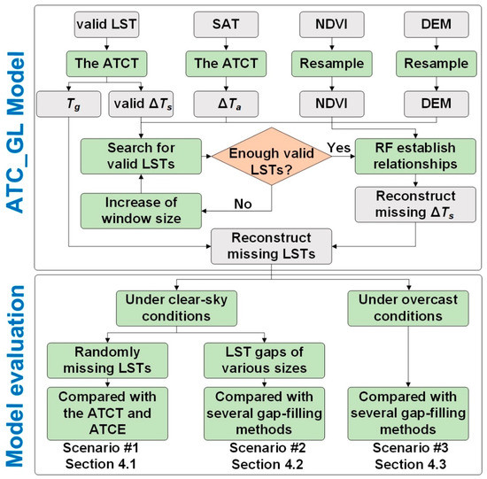 The ATC_GL incorporates both temporally global and spatiotemporally local interpolations. From the temporally global perspective (i.e., monthly or seasonal cycles), the ATC_GL incorporates the seasonal cycle of solar radiation to reconstruct intra-annual LST dynamics; therefore, it is insensitive to LST gap size, especially compared with the methods based on spatiotemporally local interpolations. From the spatiotemporally local scale, the ATC_GL incorporates the RF algorithm in obtaining the complex relationships between daily LST fluctuations and a series of relevant factors (e.g., the daily SAT fluctuations, NDVI, and DEM) within dynamic spatiotemporal windows. The ATC_GL is therefore suitable for LST reconstruction with complex surface properties. Briefly, the ATC_GL presents the following two key advantages when compared with previous ATC models: (1) the better use of spatiotemporally local information within dynamic spatiotemporal windows, and (2) a more realistic estimation of the relationships between LSTs and LST-related descriptors with the RF algorithm. The ATC_GL is a simple yet robust model that is able to reconstruct accurately spatiotemporally continuous LSTs. In addition, the ATC_GL is also independent of auxiliary data (i.e., only requiring globally acquirable LST and reanalysis data) and thus applicable globally.