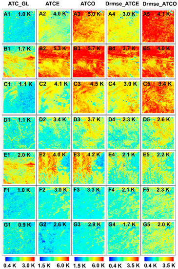 The RMSEs for the ATC_GL (A1–G1), ATCE (A2–G2), and ATCO (A3–G3) and the RMSE differences between the ATCE and ATC_GL (A4–G4); Drmse_ATCE as well as the ATCO and ATC_GL ((A5–G5); Drmse_ATCO). The number in each subgraph denotes the mean RMSE of the entire area.