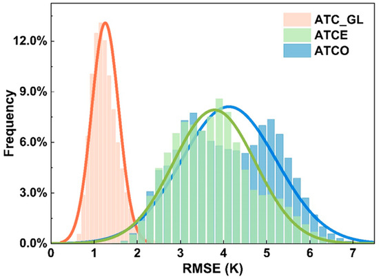 On a monthly scale, the performance of the ATC_GL was the most stable when compared with that of the ATCE and ATCO. Specifically, The RMSEs of the ATCE and ATCO were 2.6–4.4 K and 3.2–5.2 K, respectively, far exceeding the RMSE of the ATC_GL (0.9–1.7 K). Additionally, the RMSEs of the three models were relatively low from October to November and relatively high from May to July (Figure 7). The main reasons are as follows: the performances of the three models are generally related to the LST missing rate of the original MODIS LST data. There is no adequate neighborhood information when the LST missing rate is high; as a consequence, the spatiotemporal window will increase until the number of observed LSTs is satisfied. However, the use of LSTs with a large spatial or temporal distance can cause more uncertainties. Secondly, we speculate the performances of the three models are related to the LST values. The LSTs are high in the Northern Hemisphere in May to September, when the corresponding RMSEs of models are relatively large. When the LSTs are high, an annual temperature cycle may not be fully capable of capturing the seasonal variation of LSTs; as a consequence, the corresponding model RMSEs are relatively large.