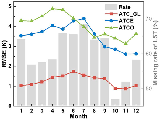 Monthly RMSEs of the ATC_GL, ATCE, and ATCO. The histogram represents the monthly missing rates of LST.