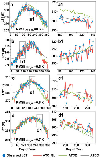 Regardless of its comparatively high performance in the modeling of intra-annual LST dynamics, the ATC_GL has some limitations. First, the ATC_GL ignores the overpassing time difference of MODIS LSTs (up to 2 h) within a daily cycle [65] and viewing angle differences among temporally adjacent days [66,67,68]. Although previous studies have shown that the accuracy enhancement after the normalization of overpassing time and angle is limited [19], the ATC_GL is still expected to benefit if these factors are considered.