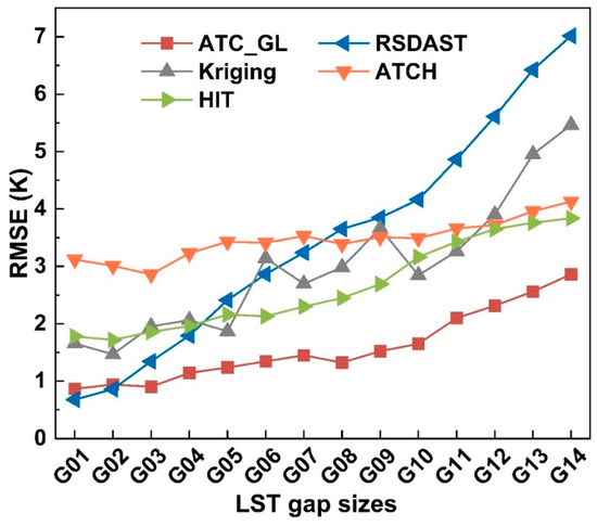 The ATC_GL had the highest accuracy in most cases, and its performance was less affected by the size of the LST gap (Figure 9). The RMSEs of the ATC_GL increased from 0.8 to 2.6 K with an increase in LST gap size. The performance of the Kriging interpolation decreased gradually with an increase in gap size, although it remained stable (1.4–2.0 K) at relatively small gap sizes (smaller than 50 × 50 pixels). The RMSEs of the HIT were 1.0–1.5 K higher than those of the ATC_GL, although the variation across time was similar between the models. The accuracy of the RSDAST was slightly higher than that of the ATC_GL at very small gap sizes (smaller than 20 × 20 pixels). However, its performance decreased dramatically with an increase in gap size, and the RSDAST was the poorest performing model at gap sizes larger than 80 × 80 pixels.