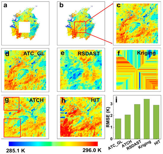The spatial details of the LSTs reconstructed using various methods with an LST gap size of 500 × 500 pixels. Subfigure (a) denotes the LST gap on an image from 10 March 2018; subfigures (b,c) are the original true LSTs; subfigures (d–h) represent the LSTs reconstructed by the ATC_GL, RSDAST, Kriging interpolation, ATCH, and HIT, respectively; subfigure (i) presents the mean RMSEs of the different methods.