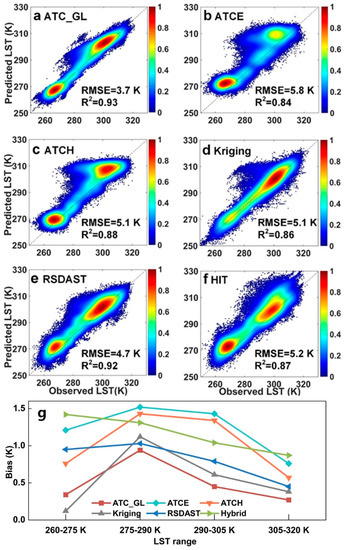 For the scenario of overcast conditions, the performance of the ATC_GL was again compared with those of the LST gap-filling methods mentioned in Strategy 2 (the ATCE, ATCH, RSDAST, Kriging, and HIT) (refer to Appendix C for the details of study areas and data). The ATC_GL had the highest accuracy in overcast conditions (RMSE = 3.7 K, R2 = 0.93; Figure 11). The RMSEs of the ATCE, ATCH, Kriging interpolation, and HIT were 5.8 K, 5.1 K, 4.7 K, and 5.2 K, respectively. Notably, the LSTs in overcast conditions may be overestimated by the ATC_GL especially in the range of 275.0 K to 290.0 K, although the level of overestimation is relatively lower when compared with other gap-filling models (Figure 10). The overestimation may be associated with the inadequate capability of SAT to fully grasp the LST dynamics under overcast conditions, especially for regions with large LST gaps [19,59]. We further need to note that the ATC_GL is indeed a framework for LST reconstruction, which can adjust parameter combinations in different scenarios. The performance of the framework is expected to improve if more auxiliary parameters related to overcast conditions (e.g., longwave and shortwave radiation and soil moisture) are incorporated [41].