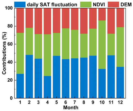 We quantified the contributions of the LST-related descriptors used in ATCT (i.e., daily SAT fluctuation, NDVI, and DEM) with an attribution approach [62]. The daily SAT fluctuation had the highest mean annual contribution (40.6%), followed by NDVI (34.9%) and DEM (24.5%; Figure 12). These results also highlight the deterministic role of daily SAT fluctuation and the indispensable contributions of NDVI and DEM in LST reconstruction. The relevance of these factors to LST reconstruction comes from: (1) the close correlation between LST and SAT under different conditions [63,64], and (2) the regulatory effects of NDVI and DEM on the daily variation of LST [59,63]. Furthermore, notable monthly variations were observed in the contributions of these three variables: (1) The contribution of daily SAT fluctuation was relatively high from May to September (exceeding 40.0%). This was likely owing to the increased amount of cloud coverage during this period that consequently weakened the regulation of LST variation by NDVI and DEM. (2) The contributions of NDVI were relatively higher in January, April, October, and December than those in the other months; this finding could be explained by sudden changes in plant cover (e.g., crop harvesting and sowing). (3) The contribution of the DEM was relatively stable within the annual cycle, with the largest inter-month difference of lower than 15.0%, probably because DEM remained unchanged throughout the year.