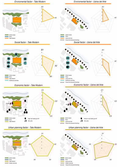 The results obtained after applying the proposed methodology to assess the architectural and urbanistic impact of the adaptive reuse of the two power plants support the importance of the project strategies and the conservation of the building, as well as the landscape and public spaces for the social acceptance of these interventions. As it can be seen from the graphs showing the obtained results (see Table 3), the environmental factor performed very well in both of the re-functionalisation projects in the industrial power plants, as they both show synergy with the environs, and both of the projects have large public space areas in a radius of 200 m, as per the highlighted parameters [38]. It should also be noted that Case Study No. 1, the Tate Modern, has a high landscape value, which was generated through the direct connection between the riverside and the public space, unlike Case Study No. 2, Usina del Arte, where there is no connection with the riverside due to the motorway that has been built along the coast. (See Figure 2)