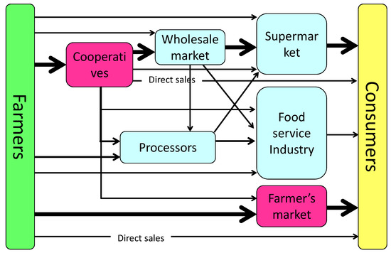 Against this backdrop, the following two points have become clear. First, agricultural companies need to make management decisions such as “where and how to sell agricultural products”; mass retailers including supermarkets want to procure domestic raw materials and ingredients in a stable manner [3]. Secondly, the presence of local distribution systems, such as farmers’ markets, has become a key component among many options for selling agricultural products [4]. In particular, traditional agricultural companies that have been linked to agricultural cooperatives are trying to shift their management styles towards local direct sales via farmers’ markets, and the direct sales are equipped with functions to support this conversion.