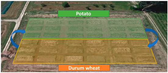 The experiment was conducted on a biennial rotation, typical of the study area, between durum wheat and potato, to compare different tillage practices and fertilization events. The treatments consisted of: (i) three soil tillage systems (conventional with moldboard plow (P), reduced tillage with a subsoiler (R), and reduced tillage with a spading machine (S)) and (ii) two fertilization sources (mineral fertilizer (M) and organic (O) with municipal organic waste). The two main crops in rotation were simultaneously cropped every year. For each crop, the treatments were replicated three times according to a randomized complete block design. The experimental field included 36 plots (2 crops × 2 fertilization sources × 2 tillage managements × 3 blocks). Each plot had a size of 60 m2 (6 × 10 m) and 5-m-wide alleys separated all plots of the experimental field in carrying out all farming operations.
