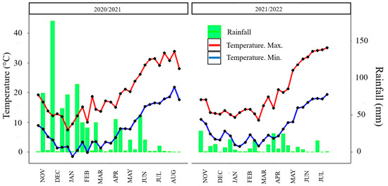 Minimum and maximum temperatures (°C), and rainfall (mm) at the experimental site, throughout the periods of study in 2021 and 2022.