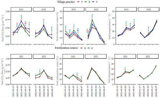 Soil CO2 emissions, soil temperature, and soil volumetric water content under the three soil tillage practices: plowing (P), subsoiling (R) and spading (S), and under inorganic (M), organic (O) fertilization sources during 2021 and 2022 durum wheat growing seasons. Bars represent standard error. No letters mean that differences between the means were not significant (p > 0.05).