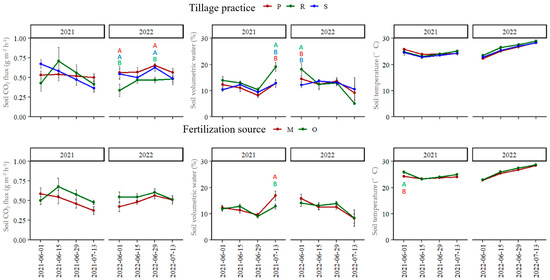 Soil CO2 emissions, soil temperature, and soil volumetric water content under the three soil tillage practices: plowing (P), subsoil (R), and spading (S), and under inorganic (M), organic (O) fertilization sources during the 2021 and 2022 potato growing seasons. Bars represent standard error. No letters mean that differences between the means were not significant (p > 0.05).