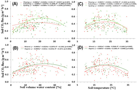 The analysis of polynomial regression also showed the dependence of the CO2 emission rate on soil temperature. The highest rate of CO2 emission was related to spading (0.50 g m−2 h−1 at 21 °C soil temperature; R2 = 0.1802; p < 0.001), the intermediate value under plowing (0.46 g m−2 h−1 at 23 °C, R2 = 0.1039; p < 0.022), and the lowest value under subsoiling (0.38 g m−2 h−1 at 19 °C; R2 = 0.1283; p < 0.008) (Figure 5C). Moreover, significant relationships were noticed under both fertilization sources. There was a higher value under organic fertilizer (0.47 g m−2 h−1; R2 = 0.908; p < 0.006) compared to the mineral fertilizer (0.45 g m−2 h−1; R2 = 0.1649; p < 0.0001, Figure 5D).