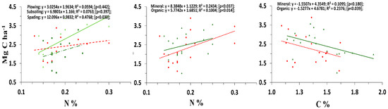 A linear regression was conducted for both crops, but significance was found only in the wheat crop data (Figure 6). The results of the linear regression show that there is a close relationship between the soil CO2 flux emissions and the total organic carbon and the total nitrogen in the soil for wheat only. Significant relationships between soil CO2 emissions and the soil nitrogen content under different soil tillage and fertilization managements were observed. However, significant relationships between soil CO2 emissions and the soil carbon content (C%) were found only under fertilization treatments. Interestingly, a significant negative relationship between CO2 emissions and C% was only detected under organic management (R2 = 0.2376; p < 0.039).
