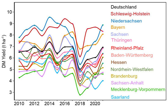 Annual dry matter (DM) yields for the different states of Germany obtained from the Statistisches Bundesamt (https://www.destatis.de/DE/Themen/Branchen-Unternehmen/Landwirtschaft-Forstwirtschaft-Fischerei/Publikationen/Bodennutzung/landwirtschaftliche-nutzflaeche-2030312217004.pdf; accessed 11 January 2021).