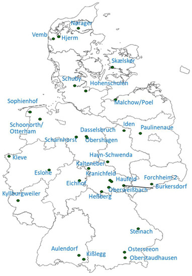 Daily weather data were gathered from meteorological sites close by the trial sites. For Germany, these were obtained from the Deutschen Wetterdienst (Germany’s National Meteorological Service, DWD; https://www.dwd.de/; accessed 12 April 2021). For Denmark, they were obtained from the online database (http://agro-web01t.uni.au.dk/KlimaDB/; accessed 14 June 2021) managed by Aarhus University.