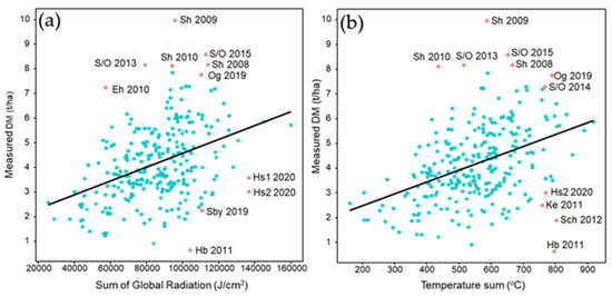 Measured grass dry matter (DM) yield of the first cut vs. temperature sum (a) and global radiation sum (b) after a temperature sum of 250 °C with a base temperature of 3 °C. Blue symbols indicated data that were included in the analysis, and red symbols those that were excluded for the years provided. Eh = Eichhof. Hb = Heßberg; Hs = Hohenschulen; Ke = Kalteneber; Og = Ovelgönne; Sby = Schuby, Sch = Scharnhorst; Sh = Sophienhof; S/O = Schoonorth/Otterham.