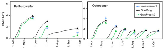 Predictions of seasonal DM production (individual cuts) by GrasProg1.0 for four selected sites from varying geographical areas, altitudes, and with different meteorological conditions (Aulendorf, Kleve, Osterseeon and Schuby with measurements over 11 to 12 years) showed generally good agreement with measurements (Figure 5, Figure 6, Figure 7, Figure 8 and Figure 9). For GrasProg1.0, the RMSE ranged from 0.59 to 0.77 t ha−1 and NSE from 0.55 to 0.71 for these four sites (Table 2; Figure 9). APSIM showed a slightly less good prediction for these four sites, with RMSE ranging from 0.59 to 0.91 t DM ha−1 and NSE from 0.22 to 0.54. In some instances, GrasProg1.0 slightly underpredicted the first cuts while APSIM at times overpredicted these. The underestimation may be because GrasProg1.0 was calibrated on a dataset, which was more intensively defoliated (8 cuts yr−1) compared with the data used for evaluation in the present study (4–5 cuts yr−1). The defoliation frequency influences various plant traits such as tiller density, which greatly influence grass growth [52], which might explain the disparities between the measurements and simulations.