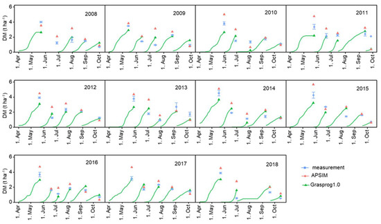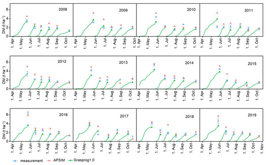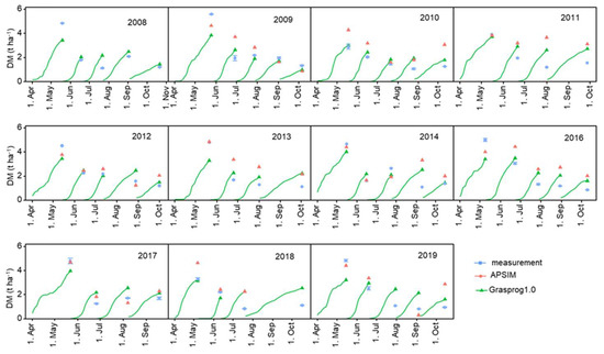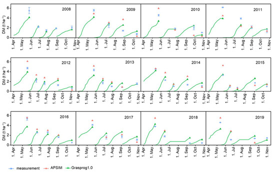 Measured grass dry matter (DM) for different cuts and years for Osterseeon, Germany. The predictions by GrasProg1.0 and APSIM are also shown.