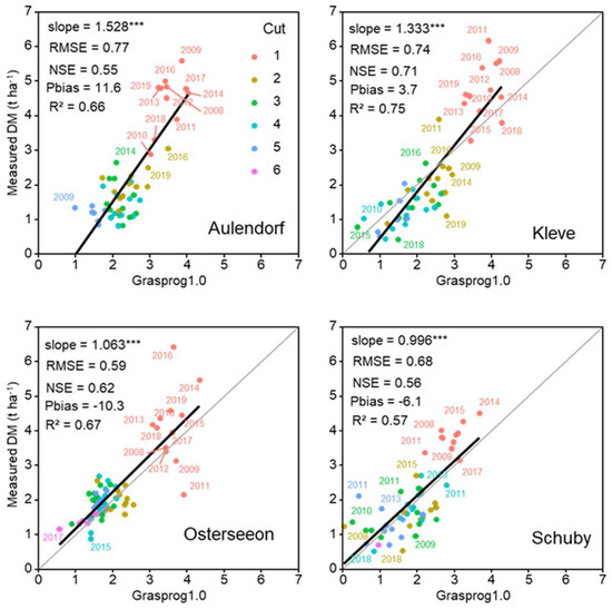 Measured grass dry matter (DM) vs. predictions by GrasProg1.0 for different cuts and years for Aulendorf, Kleve, Osterseeon, and Schuby, Germany. *** indicates significance p < 0.001.