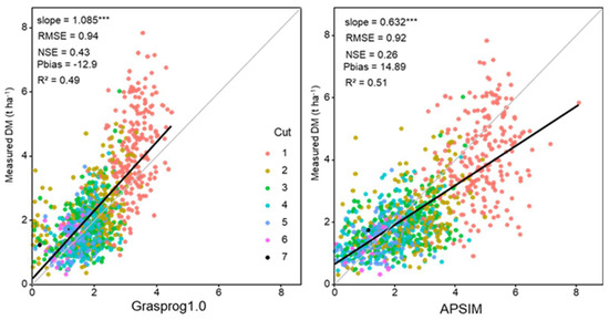 Over the entire datasets, the individual cuts were reasonably predicted with GrasProg1.0, with a RMSE of 0.94 t DM ha−1 and NSE of 0.43, and an overprediction of 12.9% (Figure 10). The performance of APSIM was slightly worse, with a RMSE of 0.99 t DM ha−1, a NSE of 0.29, and an underprediction of 12.8%.