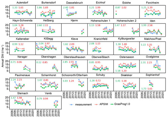 Annual measured grass dry matter (DM) and predictions by GrasProg1.0 and APSIM for different years for different locations in Germany and Denmark. The numbers show the RMSE for the two models (GrasProg1.0 green, APSIM red).