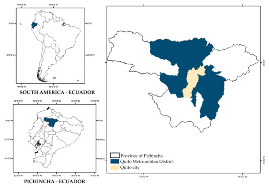 In the case of the City of Quito, the complex location of the Metropolitan District of Quito (DMQ) in the Andes Mountains makes it a dynamic and complex territory threatened by natural, economic, and social challenges that the DMQ continually faces; these motivate the management of ongoing sustainability and resilience strategies. It is important to note that the study area (rural parishes of the DMQ) includes areas classified as urban and areas classified as rural, which are in constant social, economic, commercial and environmental interaction with the consolidated city of Quito. The rural parishes of the DMQ are areas that have a certain administrative autonomy that makes it necessary to assess resilience in accordance and harmony with the city of Quito and the entire DMQ.
