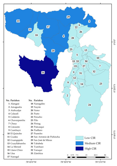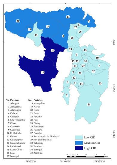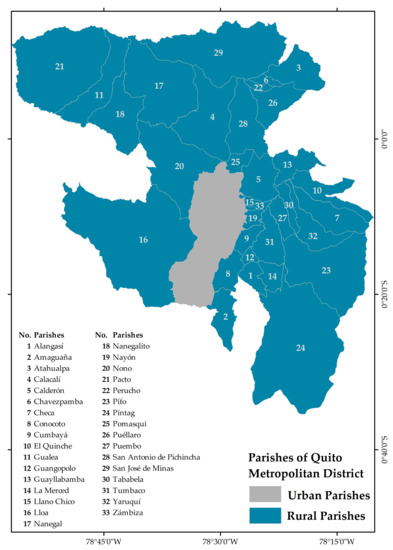 The study focuses on the rural area of the DMQ, on the 33 parishes that make it up (Figure 3): Lloa, Nayón, Zámbiza, Llano Chico, Calderón, Guayllabamba, Puéllaro, Perucho, Chavezpamba, Atahualpa, San José de Minas, Pomasquí, San Antonio de Pichincha, Nono, Calacalí, Nanegalito, Nanegal, Pacto, Gualea, La Merced, Alangasí, Guangopolo, Conocoto, Píntag, Amaguaña, Cumbayá, Tumbaco, Puembo, Pifo, Yaruquí, Tababela, Checa y El Quinche.