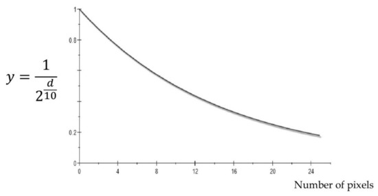 where d is the distance from the center of the window and A is the attenuation factor that controls the speed of the decrease in the function values inside the kernel. In this study A was 10 (Figure 4).