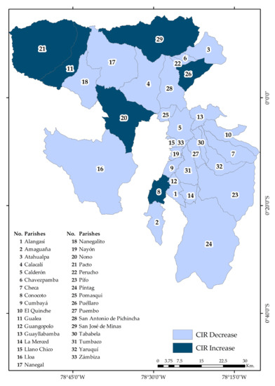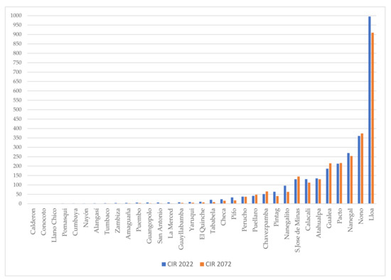 Table 8 shows the comparison of CIRs in the two time periods for each rural parish of the DMQ. It also describes the impacts that the parishes will experience over the next 50 years due to spatial urban expansion, settlements and population growth. Figure 9 shows CIR changes (2022–2072).