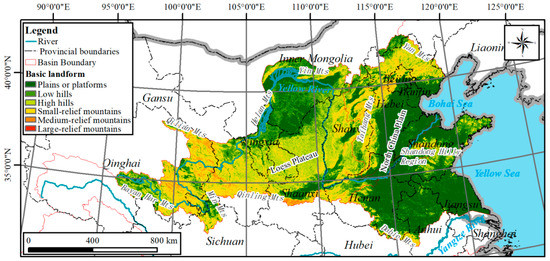 The GYRR is bounded by the Yanshan and Yinshan Mountains in the north, Helan and Qilian Mountains in the west, Qinling and Dabie Mountains in the South, and Bohai and Yellow Sea in the East. The division of the surrounding mountains causes the GYRR to become an independent geographical unit. The Yellow River, which has changed its course for many times, has become the tie linking different parts of the geographical unit. This area has become the main and core area of the Yellow River civilization. In terms of administrative divisions, the GYRR occupies all of Shandong, Shanxi, and Ningxia, most places in Henan and Hebei, the east part of Qinghai, the middle and north parts of Shaanxi, the north part of Jiangsu and Anhui, the south part of Gansu, the northwest corner of Sichuan, and the middle part of Inner Mongolia. A total of 12 provinces are involved. In terms of geomorphology, the western areas of the GYRR are the mountainous areas, while the eastern part is a large area of alluvial plains. The area percentage of plains and platforms is about 34.96%, and that of mountainous areas is 65.04% (Figure 2).