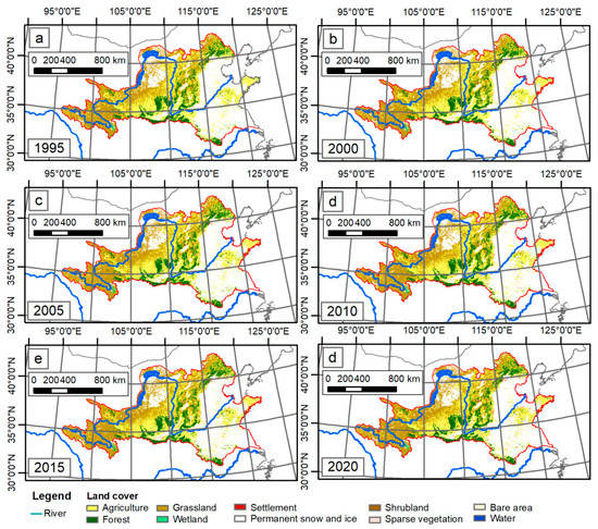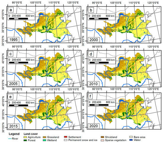 Land cover of the GYRR from 1995 to 2020. (a) Land cover in 1995; (b) land cover in 2000; (c) land cover in 2005; (d) land cover in 2010; (e) land cover in 2015; (f) land cover in 2020. Although the size of the pictures was limited, we could still find the subtle differences between them. For example, the settlement areas displayed in red shows an obvious increasing trend.