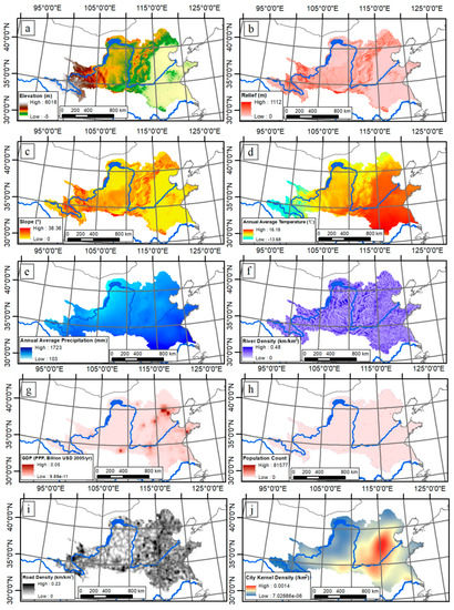 Impact factors considered in land cover prediction. (a) Elevation; (b) relief; (c) slope; (d) annual average temperature; (e) annual average precipitation; (f) river density; (g) GDP; (h) population; (i) road density; (j) city kernel density. We have considered as many natural and socio-economic factors as possible based on the availability of the data.