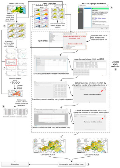 In order to achieve long-term peace and stability in the Yellow River Basin, the Chinese government has set the ecological protection and high-quality development of the Yellow River Basin national strategies that are equally as important as the coordinated development of Beijing, Tianjin, and Hebei, the development of the Yangtze River economic belt, the construction of the Great Bay area of Guangdong, Hong Kong, and Macao, and the integrated development of the Yangtze River Delta [24]. In this study, we performed the analysis of land cover changes and modeled the future scenario of Land cover with the help of the Modules for Land Use Change Simulation (MOLUSCE) plugin within QGIS software [25]. As compared with other land cover simulation tools, MOLUSCE has the advantages of being open source, free of charge, and simple to operate. We used land cover data from 1995 to 2020 with a five-year interval, along with spatial variables, such as elevation, relief, slope, monthly average temperature, annual precipitation, river network density, Gross Domestic Product (GDP), population, road network density, and city density. The logistic regression was used to construct transition potential modeling, and the Cellular Automata was used to do the future land cover simulation of 2030. On the other hand, we analyzed the land cover changes between different years, especially the land cover changes in the mountainous areas of the Great Yellow River Region (GYRR), and comprehensively discussed relationships between land cover and the mountain hazards in this region. This study confirms that the MOLUSCE plug-in could be effectively applied to the simulation of land cover on a large regional scale, and it is also an attempt to explore the relationship between land cover change and mountain hazards on a large regional scale.