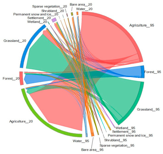 The area transfer analysis was also performed between different land cover types. According to the area transfer matrix (Table A1), between 1995 and 2020, large change situations include: 11,171 km2 agricultural land was transformed into forest land, 53366 km2 agricultural land was transformed into grassland, and 20,047 km2 agricultural land was transformed into settlement land. In terms of forest land, 10,233 km2 forest land was transformed into agricultural land, and 101,506 km2 forest land was transformed into grassland. On the other hand, 52,088 km2 grassland was transformed into agricultural land, 12,597 km2 grassland was transformed into forest land, and 7645 km2 grassland was transformed into settlement land. The Chord diagram (Figure 6) was used to express the land cover change. It was found that agriculture, grassland, and forest are the main land cover types, and account for most of the land studied.