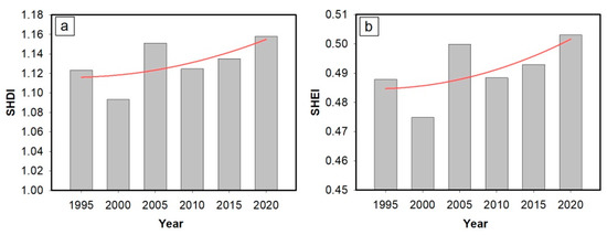 Landscape pattern index analysis. (a) SHDI of GYRR; (b) SHEI of GYRR. The red line in the figure is a trend line added by the authors.