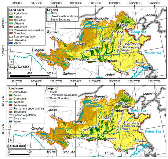 Actual and projected land cover in 2020. (a) Projected land cover in 2020; (b) actual land cover in 2020. We know that the more similar the two above maps are, the better the simulation results will be. However, there are still some subtle differences between the two maps. For example, the expansion trend of the simulated settlements was still conservative compared with that of the real settlements, and the real settlements expanded more rapidly, for example, in cities in Henan Province.