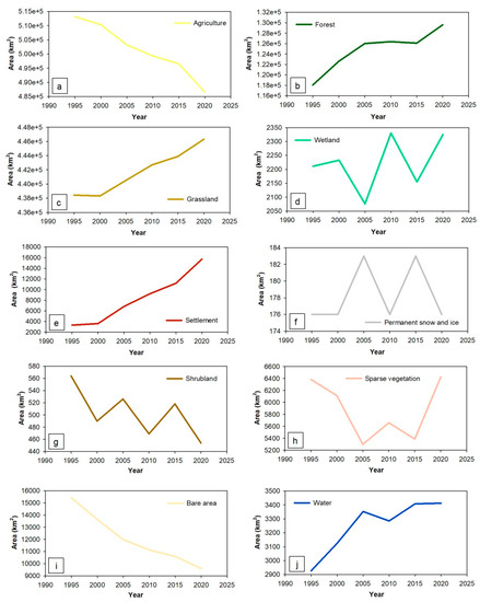 The land cover data used in this study (1995, 2000, 2005, 2010, 2015, and 2020) were downloaded from the land cover classification data set released by the European Space Agency (ESA) climate change initiative [42]. The spatial resolution is 300 m. Using the international Intergovernmental Panel on Climate Change (IPCC) land categories, the land cover types were divided into 10 categories: (i) agriculture, (ii) forest, (iii) grassland, (iv) wetland, (v) settlement, (vi) permanent snow and ice, (vii) shrubland, (viii) sparse vegetation, (ix) bare area, and (x) water (Figure 3). We resampled these land cover data and obtained multi-temporal 1000-m resolution land cover data.
