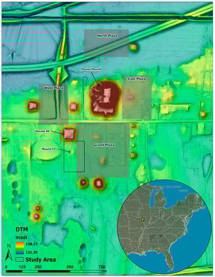 Barrier and Kassabaum ([], p. 162) noted that gathering places such as plazas are ubiquitous; they argue that the cyclical and periodic rhythms of social practice lead to the creation of imagined communities that build social ties extending far beyond biological kinship. We add that plazas can also represent social contradictions. They can be exclusive, limiting who can enter and participate in gatherings within them, or they can—sometimes simultaneously—be open and facilitate inclusion through visibility of what occurs within them. This tension can create a form of symbolic communication that helps regulate what can take place within plazas ([,], p. 391, pp. 447–449) while also enabling the creation of various levels of social inequality in communities who define and use plazas []. The plazas and surrounding occupation areas of the American Indian city of Cahokia [,,] therefore offer a unique perspective into the ways changes in the physical structure and use of a plaza mirrored micro-histories of Pre-Columbian social relationships over the course of its construction and use [,]. Using LiDAR-based visualizations and data from multi-instrument geophysical surveys, we present new information regarding changes in Cahokia’s Grand Plaza (Figure 1). In doing so, we speak to changes in the creation of earthen monuments that line the western edge of the Grand Plaza, the defensive wooden palisade, and the nature of the buildings and features that lined the exterior of the Grand Plaza. Our results offer new insights into the details underlying the development of Cahokia as Native America’s first city.