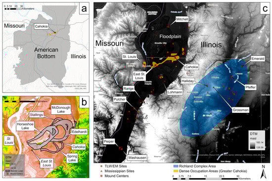 Maps of the American Bottom region, physiographic features, and archaeological sites discussed in the text. (a) Map showing the geographic extent of the American Bottom region with respect to CMSHS; (b) DTM map showing meander loops of the Mississippi River shaded in gray (regular text) and mound centers (italicized text); (c) DTM map showing the extent of the Greater Cahokia Area and Richland Complex denoting a selection of sites spanning the Terminal Late Woodland/Emergent Mississippian and Mississippian periods.