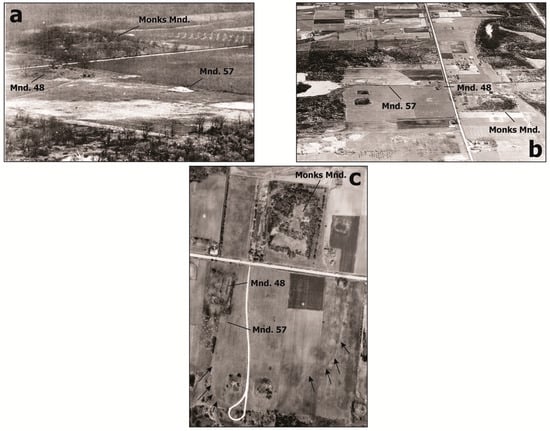 The Goddard and Reeves aerial photographs revealed the presence, form, and state of preservation for several mounds in the central portion of the Cahokia site. Mound 57 is discernible in oblique photographs captured by Goddard and published by Crook [] as a conical raised area of light-colored vegetation (Figure 4a,b). The historic home that once stood atop Mound 48 and two small farm buildings appear near Mound 48’s southeastern corner. In other aerials by Reeves ([], p. 73), remnants of the palisade wall are visible along the eastern side of the Grand Plaza (Figure 4c) but fade along the western edge of the plaza south of Mound 48. An area of lightened vegetation corresponding with the location of Mound 57, south of Mound 48, is visible in this planview photograph. This depiction represents the mound as more rectilinear in shape.