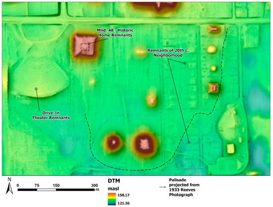 LiDAR-derived surface visualizations of the western border of the Grand Plaza allowed us to combine information from historic aerial photographs and previous excavations in this area to better understand how this portion of Cahokia was spatially arranged. Surface visualizations also provided insights on iterations of the palisade and its relationship with Mound 48. The blended sky-view/DTM imagery we produced depicts the complex palimpsestic landscape we know modern Cahokia to be, complete with remnants of a mid-late twentieth century neighborhood and drive-in movie theater (Figure 5). Traces of the historic house that once sat atop Mound 48 are also visible. However, several features important to our study stand out. The first is an iteration of Cahokia’s palisade.