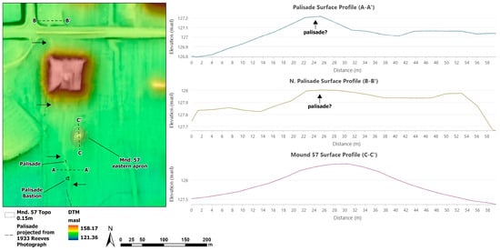 Grand Plaza and surrounding areas visualized as LiDAR-derived blended image of the DTM and sky-view factor. The linear rise discussed in the text is indicated by arrows, and the palisade remnants identified in excavation [] are overlaid on rise and designated. Topographic profiles for palisade and Mound 57 are also shown.
