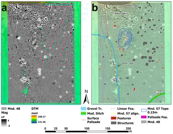 Results and interpretation of the magnetic data from this study; (a) magnetic gradiometery imagery overlaid over the local DTM; (b) interpretive layers overlaid onto magnetic gradiometery imagery set at 50% opacity.