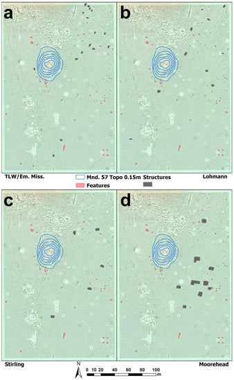 As their names imply, these wall-trench structures roughly conform to “L” shapes in planview, consisting of a larger rectilinear room with a smaller addition. Although assuming a variety of forms at both Cahokia and its contemporaneous settlements nearby as far back as the 11th century CE, L-shaped structures have been interpreted as having special uses, an inference based on examinations of their distinctive storage additions ([,,,], p. 223, p. 39, p. 145). Common characteristics of several special buildings that conform to L, T, and/or cruciform shapes during the Mississippian era in the American Bottom include: their placement around plazas [,,,,,], a close spatial proximity to mounds ([,], pp. 39, 144–145, pp. 54–56), and circular-shaped sweat lodges ([,,], p. 63). These types of buildings are also known to contain special items ([,,,], p. 44, p. 267), suggesting that they were places where ritual participants utilized well-crafted paraphernalia. Moreover, the position of these buildings affronting the largest and most public plaza at Cahokia speaks to their importance within the context of how this space was arranged, even if at one point in the city’s history. We should note that we also identified several (n = 5; see Table S1) circular features that are not easily assigned to a temporal phase but, as we mention above, may represent special-use structures such as sweat lodges. The spatial correlation of two circular buildings within the cluster of Moorehead structures helps support this hypothesis (see Figure 7b and Figure 8d).