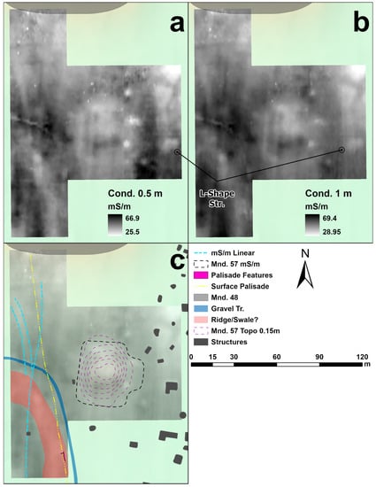 Our EMI survey covered a sample of the magnetometry survey, including both Mound 57 and areas south of Mound 48 where palisade remnants should exist. The imagery produced from our conductivity data collected from the 0.5 m and 1 m coil separation showed some correlation with subsurface historic metal debris we identified in the magnetometry survey, as well as the CMSHS modern gravel walking path (Figure 9). However, one of the L-shaped structures identified in the magnetometry data appears east of Mound 57 as a feature of low conductivity. Information from the conductivity data over Mound 57 and the palisade area also offered subsurface insights that the magnetometry survey did not. Beginning with the palisade, a 15-m-wide band of low conductivity can be seen trending from the south to the western edges of our survey area. This feature is likely a sand ridge associated with the buried ridge and swale system that has been documented beneath the plaza [,,]. However, emerging from the northern boundary of this subsurface alluvial feature is a 4.5-m-wide linear anomaly exhibiting low conductivity; a long linear anomaly of high conductivity running the entire north–south portion of our survey area is also present. Because this feature exhibits low conductivity, as described by Dalan [] for EMI responses to palisade remnants, and is approximately the same width as the topographic expression of the palisade we identified using LiDAR-derived visualizations of Downtown Cahokia, it could represent subsurface remnants of a different iteration of Cahokia’s palisade that stretched west of Mound 48 in its final form.