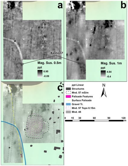 The magnetic susceptibility imagery from the 0.5 m coil generally exhibits little more than surface noise related to the gravel walking path and the historic debris at the base of Mound 48 (Figure 10). However, data from the 1 m coil separation indicate the presences of linear features oriented north–south at the western limits of our EMI survey, as well as potential remnants of a bastion associated with the palisade identified by Altizer and colleagues []. Observations from Altizer et. al.’s excavations into the eastern and southeastern palisade wall features indicated that 20 meters typically separate the bastions connected by curtain walls ([], pp. 30–31), an estimate that roughly conformed to the length of our proposed bastion in the magnetic susceptibility imagery and the bastion identified through excavation immediately south of it ([], pp. 7–8). Unfortunately, little information pertaining to any mound-top features or construction fills associated with Mound 57 is present in the magnetic susceptibility data from the EMI survey.