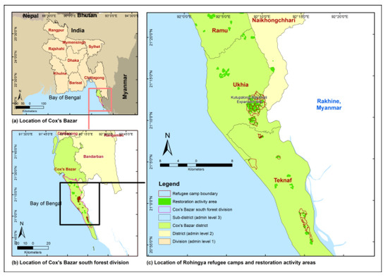 Location of Cox’s Bazar district (a), Cox’s Bazar south forest division (b), refugee camps and areas of restoration activities (c).