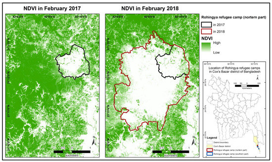 Such prevailing land degradation dynamics in the area are further exacerbated by fluctuating but persistent arrivals of Rohingya refugees/FDMNs, with a massive influx of around 742,000 Rohingya refugees/FDMNs since 25 August 2017 [5]. The vast majority live in 34 extremely congested refugee camps, including the largest single site, the Kutupalong-Balukhali Expansion Site, which accommodates more than 635,000 Rohingya refugees/FDMNs [14]. All the camps are in Cox’s Bazar south forest division. This put significant pressure on the regional landscape resulting from removal of trees roots and cover grass to provide shelter and fuel for this forcefully displaced population. Figure 2 depicts the loss of vegetation from February 2017 to February 2018 due to the expansion of the Kutupalong-Balukhali refugee camp.
